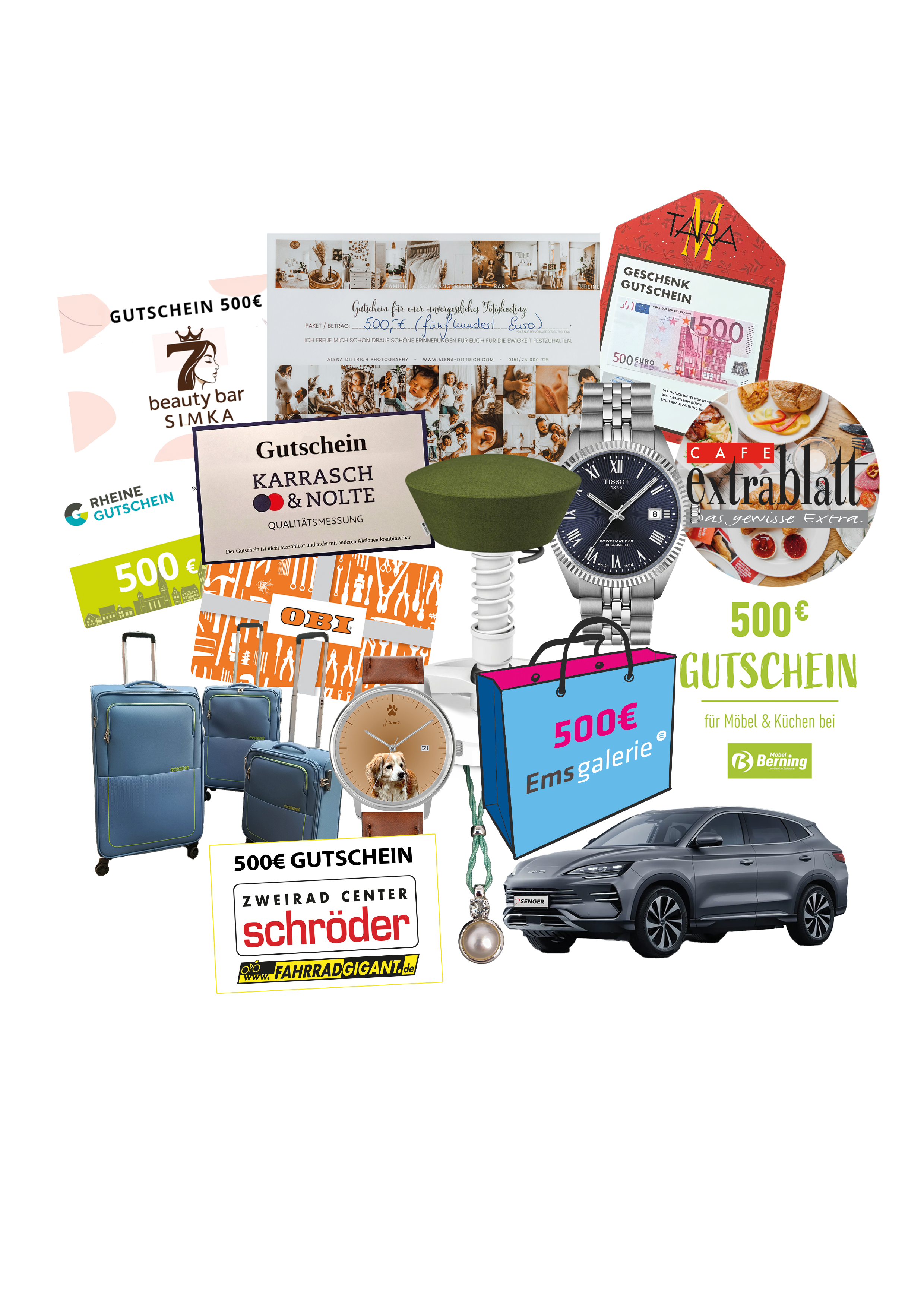 Dein(e) Code(s) sind im Lostopf gelandet und vielleicht hast du am 4. Januar 2025 bei der Live-Verlosung in der Emsgalerie die Chance auf einen Hauptgewinn!